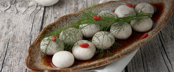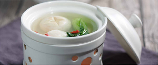 1锅中放入高汤,加入鱼丸白蘑菇小火炖煮。