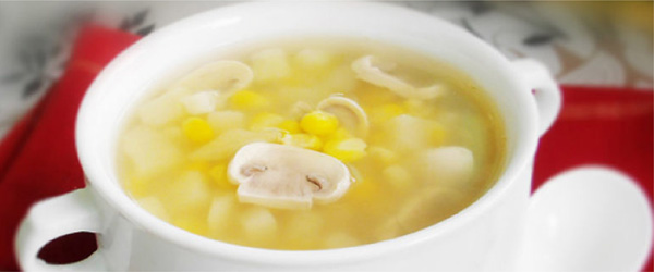 2蒸熟的土豆切粒或压成泥,锅中加水3碗,玉米、土豆和白蘑菇一起下锅,中火煮约十分钟至所有食材都熟,最后加盐调味即可。