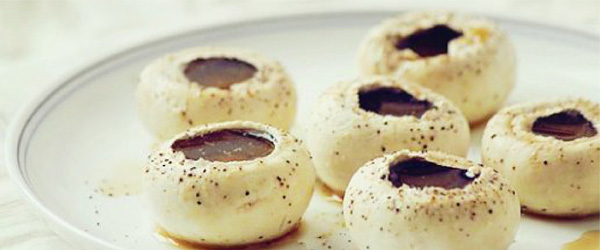 1平底锅,薄薄刷一层橄榄油,白蘑菇去蒂后头朝下排列好,开小火,盖上盖子。