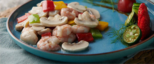 1白蘑菇切片,青红椒切方丁,跟虾仁下锅飞水,沥干水分。