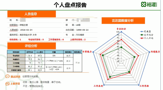 人力资源部根据受评员工的考核结果,对受评员工的专业知识积累、工作现状、发展潜力及存在问题进行全方位、立体化盘点分析。