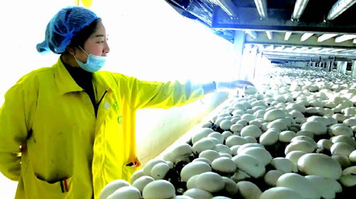 近日,在位于江苏省灌南县的江苏裕灌现代农业科技有限公司生产车间,工人们正在管护双孢菇。
