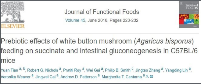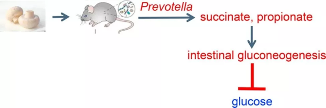 在动物实验中,给老鼠喂食白蘑菇可以改变它们肠道微生物的组成,生成更多的短链脂肪酸,特别是琥珀酸(succinate)中的丙酸(propionate)。先前研究表明,琥珀酸和丙酸可以改变控制葡萄糖生成所需基因的表达。