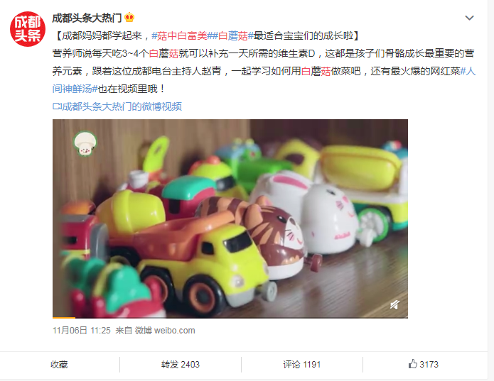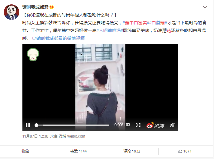 各大网红博主也纷纷出动,除了研究白蘑菇在五味陈杂的九宫格火锅的滋味,还出招烹饪各种有关白蘑菇菜品。更甚的是还有美食、健身大V晒出了日常白蘑菇盛宴食谱:挑战七天吃白蘑菇、白蘑菇七日瘦身餐、最强蘑菇宴等。一夜之间,代表着健康美味的菇中白富美白蘑菇成为了全网最红的明星,而广大的网友也成为了高手在民间的代表,将白蘑菇菜品发挥到极致。
