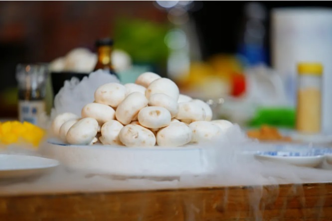 吃法也有讲究,总结就是是充满仪式感的“吸一吸”、“蘸一蘸”、“咬一咬”:用小勺盛起煎好的白蘑菇,先吸掉中间烹饪出来的汤汁,再蘸各种调配出来适合自己口味的酱汁调料,带着满满的酱汁与蘑菇一起咬上一口,瞬间,白蘑菇的鲜与蘸料的混合味道在舌尖绽放,而层出不穷的变化在口腔中延伸,变出类似味道的前调、中调、后调,饱满而细腻,令人尝而不忘。