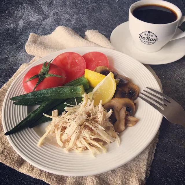 鸡胸肉晾凉后顺着肌肉纤维将其撕碎放入盘中,放入煎好的蘑菇片,随后番茄块,秋葵摆入盘中,挤入少许柠檬汁和黑胡椒粉调味即可。