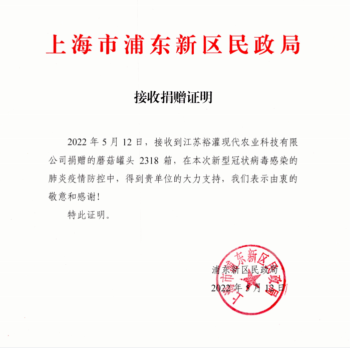 考虑到本次疫情,上海有许多人们隔离在家,急需要耐储存的食材,所以江苏裕灌将原本用于出口创汇的蘑菇罐头拿来做捐赠。这些蘑菇不仅可以开罐即食,还可以二次搭配烹饪,并且蘑菇含有丰富的维生素D,维生素D有助于钙的吸收,所以老年人和小孩常吃的话有助于帮助他们对钙的吸收,预防佝偻病和骨质疏松等症。裕灌的此举爱心也得到了上海浦东民政局高度认可。