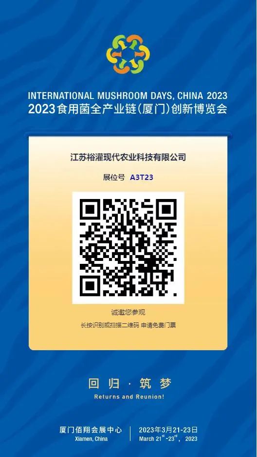 本次创新博览会召开时间为2023年3月21-23日,江苏裕灌受邀参加参会,届时将展出精品装白蘑菇、白蘑菇罐头、褐菇(牛排菇)等产品,期待与您相约。此次展会,江苏裕灌现代农业科技有限公司位于A3T23展位,我们满怀热情、整装待发。