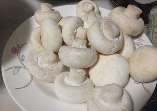 正常的口蘑是白色或微带黄,菌褶呈淡褐色,菌柄的中央部分呈现空心,颜色是深灰色或者褐色,而漂白的口蘑的菌柄的中央部分呈现白色。白蘑菇在采摘、运输、储存过程中,容易机械损伤而褐变,所以不会是均匀的纯白色,含增白剂的白蘑菇表面看起来很湿、很亮。