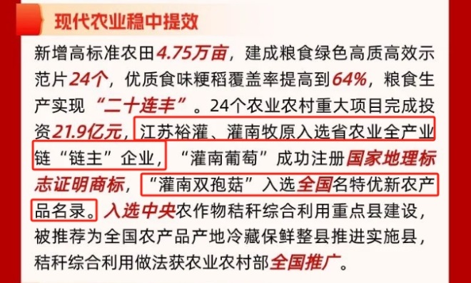 报告中特别提及了江苏裕灌现代农业荣获“江苏省农业全产业链/链主”企业称号,裕灌白蘑菇作为“灌南双孢菇”代表入选“2023全国名特优新农产品”名录。这不仅是灌南县农业发展的有力证明,更是对江苏裕灌的高度认可。