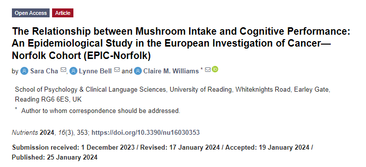 2024年1月25日,英国雷丁大学的研究人员在" Nutrients "期刊上发表了一篇题为" The Relationship between Mushroom Intake and Cognitive Performance:An Epidemiological Study in the European Investigation of Cancer-Norfolk Cohort(EPIC-Norfolk)"的研究论文。