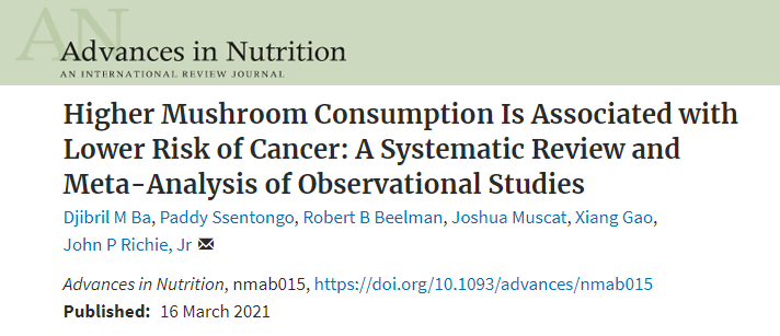 值得一提的是,美国宾夕法尼亚州立大学的研究人员在" Advances in Nutrition "期刊上发表了一篇题为" Higher Mushroom Consumption Is Associated with Lower Risk of Cancer:A Systematic Review and Meta-Analysis of Observational Studies "的研究论文。