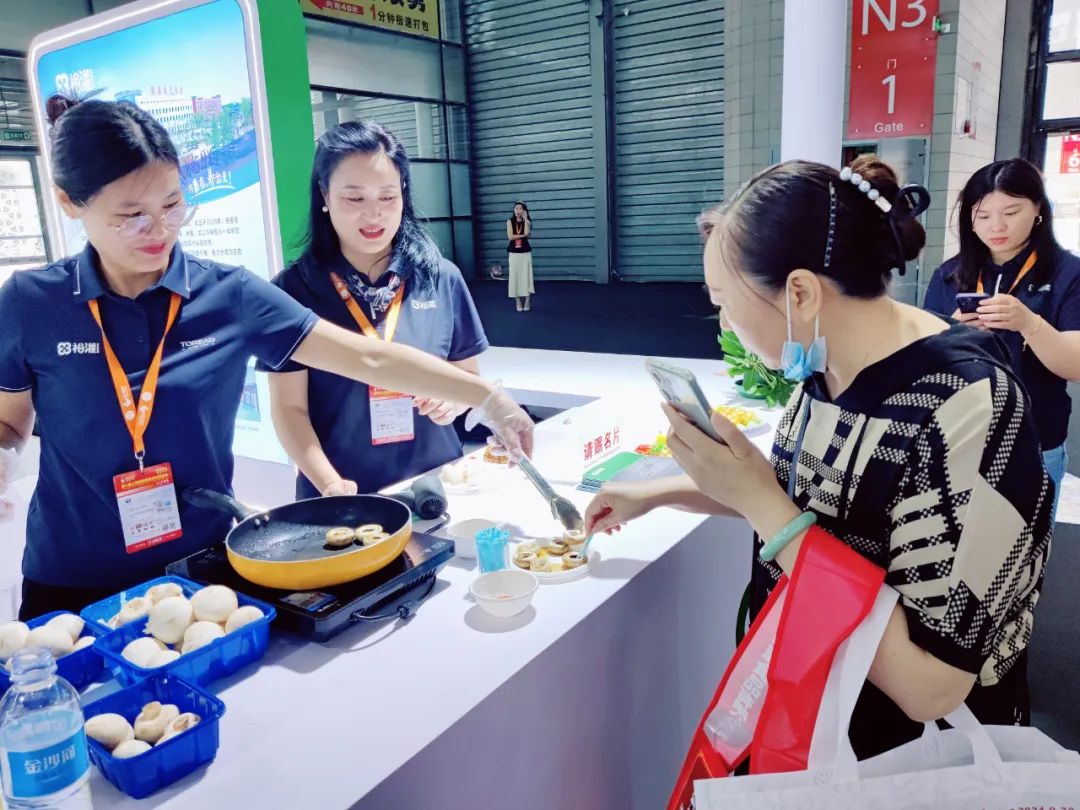 展会现场,江苏裕灌的展位吸引了众多观众和采购商的目光。公司带来了丰富多样产品形态,包括各类优质白蘑菇、蘑菇盆栽以及蘑菇罐头等。同时,在展台还设置了烹饪品尝区,现场烹饪的白蘑菇香气四溢,充分展示了其在食材领域的深厚底蕴和创新能力。白蘑菇产品不仅品质上乘,而且口感独特,赢得了现场观众的一致好评。