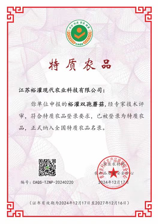 近日,江苏裕灌现代农业科技有限公司(以下简称“裕灌”)的双孢蘑菇成功入选农业农村部农产品质量安全中心公布的2024年第三批特质农品名录,标志着裕灌种出了国家级“特质农品”双孢蘑菇,实现了连云港市全国“特质农品”零的突破。