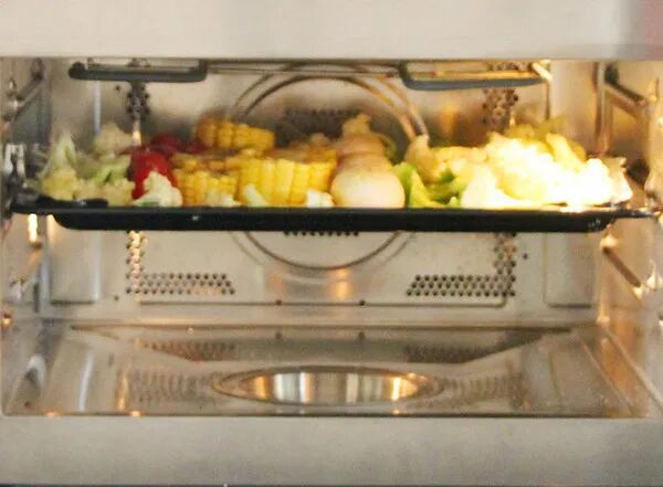 蒸烤箱以热风功能、200度预热好后,把蔬菜盘放在上层,烤18分钟左右即可。