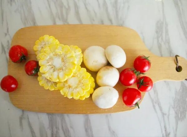 玉米切成段,白蘑菇、小番茄洗干净,青椒切成块,花菜摘成小朵,用盐水浸泡十分钟后捞出,沥干水分备用。
