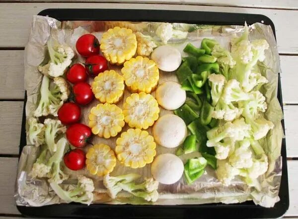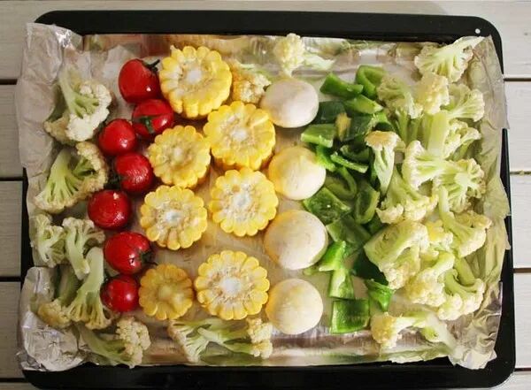烤盘上铺上一张锡纸,把所有蔬菜用厨房纸擦干水分,摆在烤盘上。